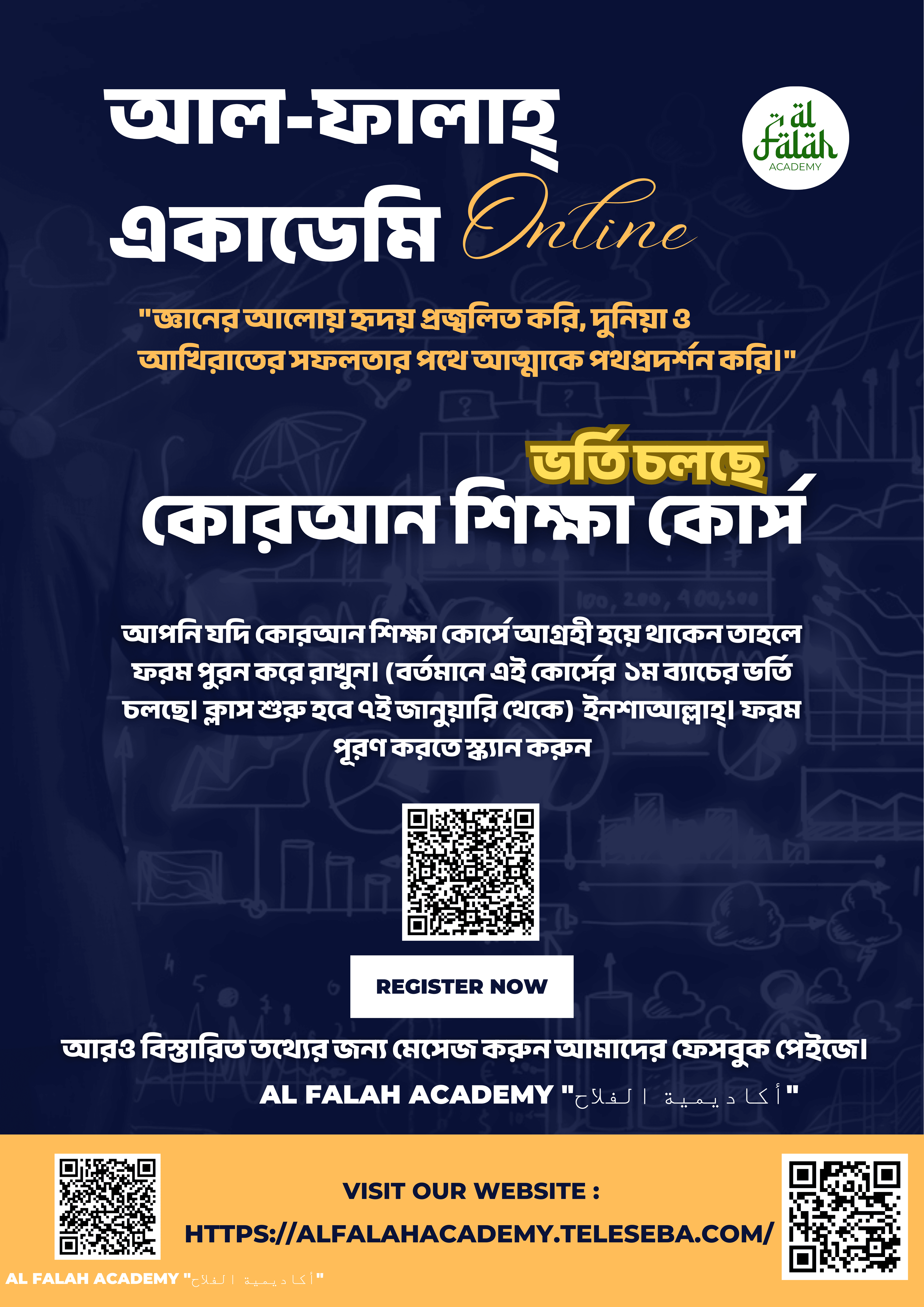 আসসালামু আলাইকুম ওয়ারাহমাতুল্লাহি ওয়াবারাকাতুহু। "আল ফালাহ একাডেমি এমন একটি বিশ্বাস দ্বারা পরিচালিত যা বলে, ইসলামী জ্ঞান একটি অর্থবহ ও পরিপূর্ণ জীবনের ভিত্তি। এই প্ল্যাটফর্মটি তৈরি হয়েছে এমন একটি ভিশন থেকে, যেখানে প্রতিটি ব্যক্তির জন্য প্রামাণিক ইসলামী শিক্ষা সহজলভ্য হবে, তারা যে কোনো পর্যায়েই থাকুক না কেন তাদের আধ্যাত্মিক যাত্রায়।