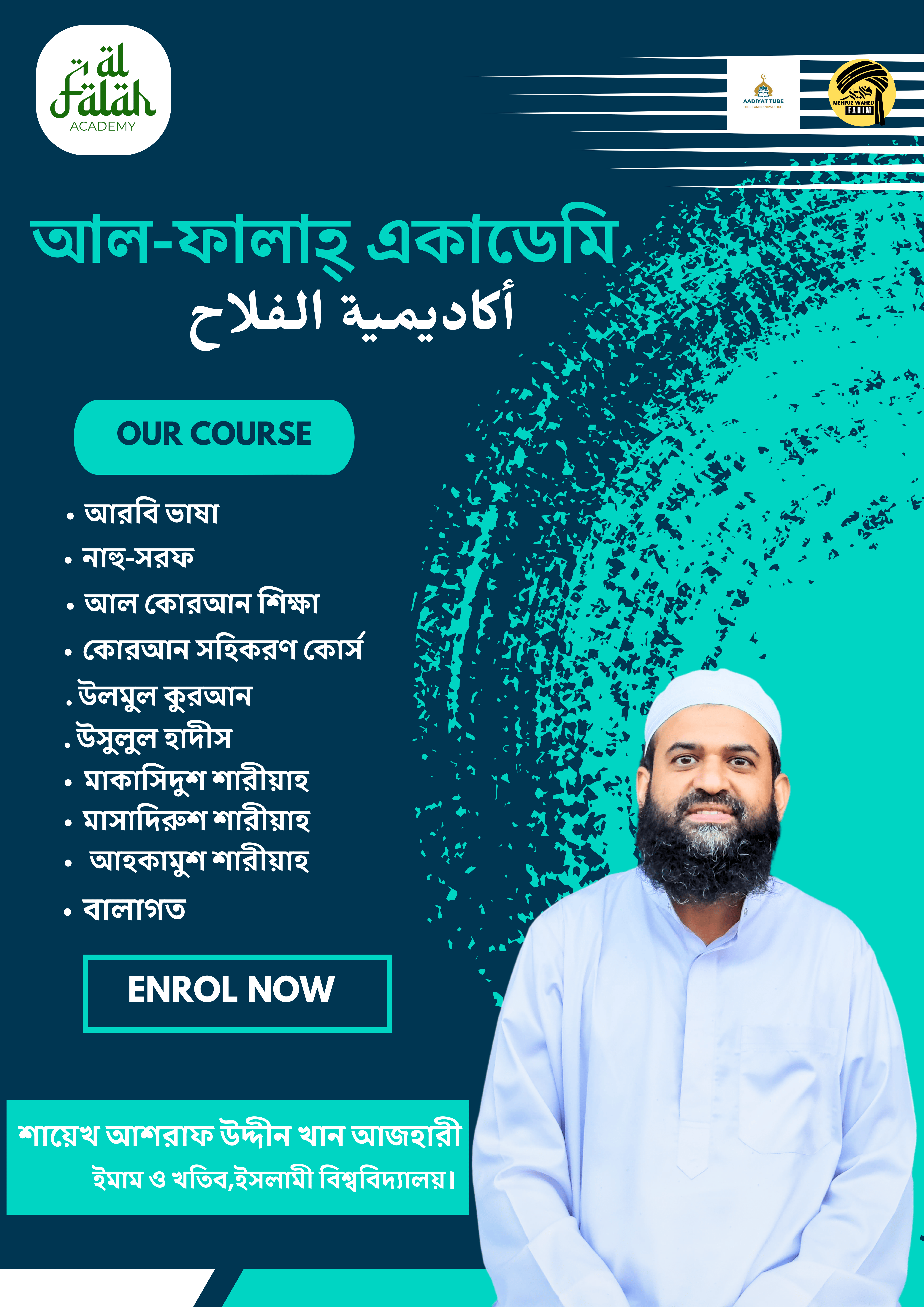আসসালামু আলাইকুম ওয়া রাহমাতুল্লাহি ওয়া বারাকাতুহ, আল ফালাহ একাডেমি একটি এমন পরিবেশ তৈরি করতে প্রতিশ্রুতিবদ্ধ, যেখানে ইসলামী জ্ঞানের অন্বেষণ এবং ব্যক্তিগত উন্নতি কুরআন ও সুন্নাহর শিক্ষার সাথে সামঞ্জস্যপূর্ণ হয়। এই প্রতিষ্ঠানের ডিন হিসেবে, এটি আমার জন্য একটি সম্মান যে, প্রতিটি শিক্ষার্থীকে এমনভাবে প্রস্তুত করা, যাতে তারা শুধুমাত্র জ্ঞান অর্জনই না করে, বরং আমাদের সুন্দর দ্বীনের নীতিগুলো দৈনন্দিন জীবনে অনুসরণ করতে পারে। আমাদের লক্ষ্য হলো ব্যক্তিদের জ্ঞান অর্জনে অনুপ্রাণিত করা, তাদের ঈমান শক্তিশালী করা এবং সমাজে ইতিবাচক পরিবর্তনের আলোকবর্তিকা হওয়ার জন্য প্রস্তুত করা। আসুন আমরা সবাই মিলে এমন একটি সম্প্রদায় গড়ে তুলি, যা ইসলামের প্রকৃত মর্মবাণী—করুণা, ঐক্য এবং এই দুনিয়া ও আখিরাতে উৎকর্ষ সাধনের প্রতি নিবেদিত। আল্লাহ (সুবহানাহু ওয়া তা'আলা) আমাদের এই মহৎ প্রচেষ্টায় পথপ্রদর্শক হোন এবং আমাদের কাজগুলোতে বরকত দান করুন। বারাকাল্লাহু ফীকুম,